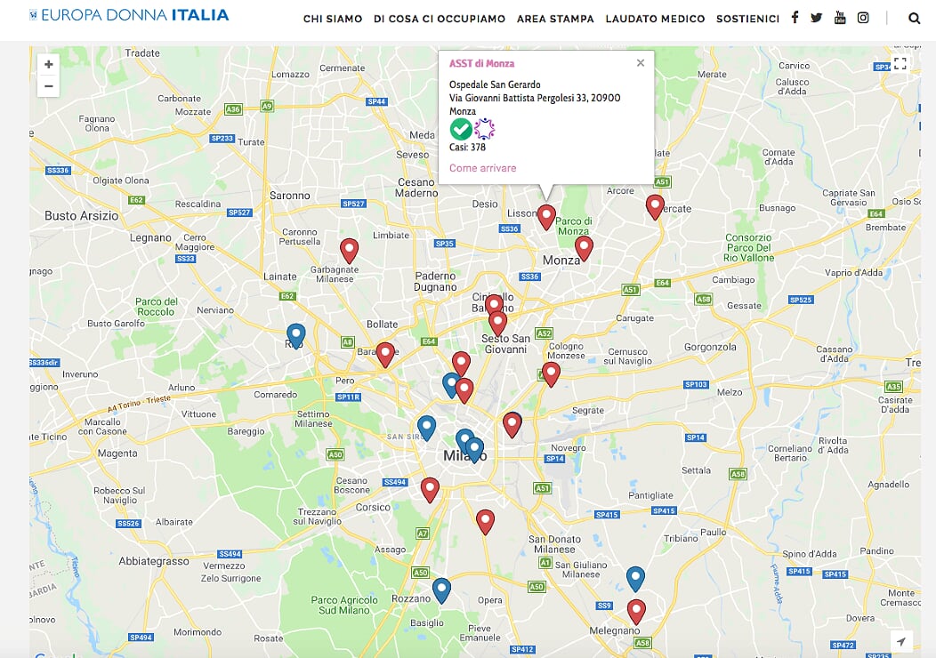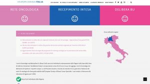 – uno strumento di geolocalizzazione dei centri di senologia multidisciplinari e delle associazioni presenti sul territorio, per permettere alle donne di individuare rapidamente, e in tutta sicurezza, le strutture qualificate più vicine e contattarle. Le singole pagine regionali raccolgono centri e associazioni, nonché le iniziative e le news delle associazioni e le delibere regionali che riguardano il tumore al seno. Una sorta di pannello di controllo di tutto ciò che avviene a livello regionale sul tumore al seno.