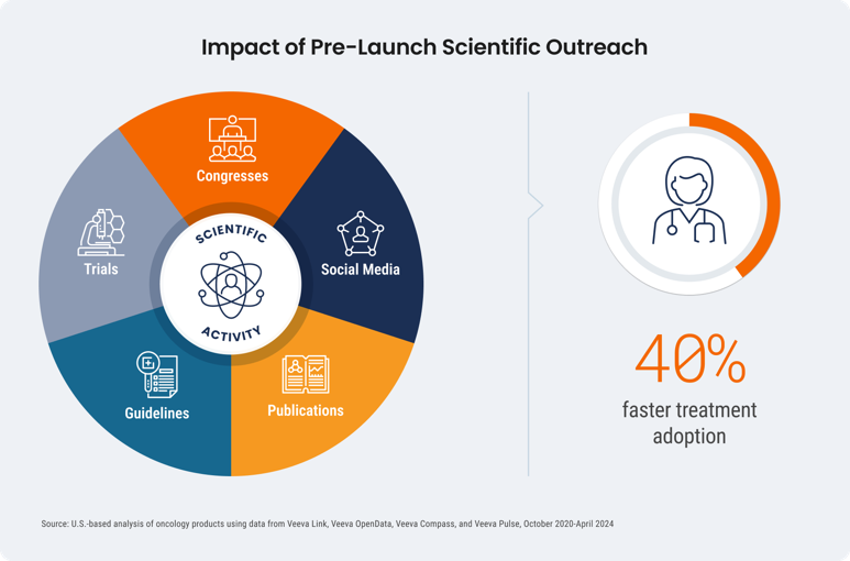 - Le attività scientifiche mirate nella fase pre-lancio accelerano l’adozione del trattamento: coinvolgendo i principali esperti ai congressi, aiutando a sviluppare le linee guida cliniche e assicurando la copertura nelle pubblicazioni pertinenti prima del lancio, le aziende registrano un’adozione del trattamento più rapida del 40% rispetto a quelle che investono meno in questo tipo di attività. Veeva Pulse dunque dimostra che un maggior numero di risorse destinate ai team del medical affairs in questa fase può incrementare il successo del lancio.